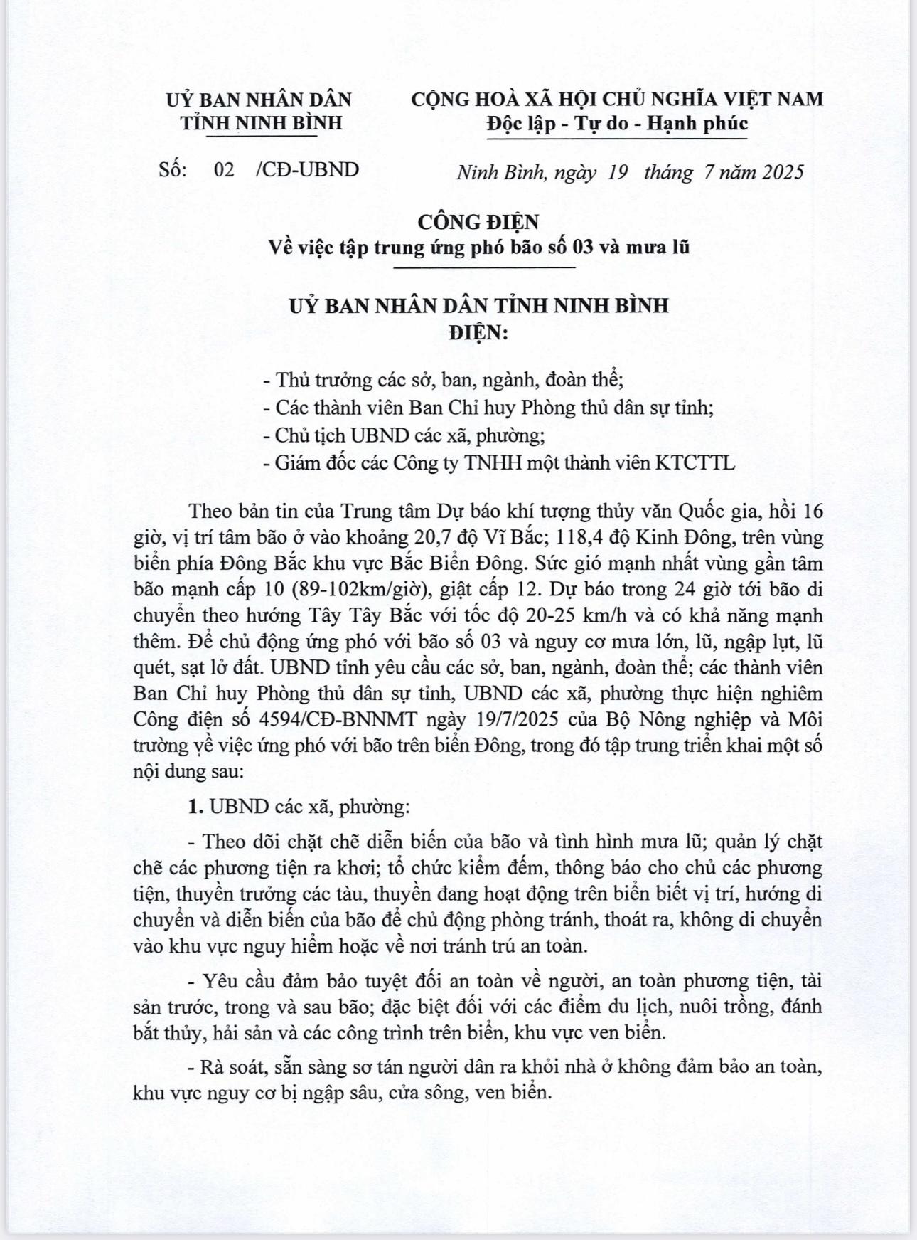 Công điện của UBND tỉnh Ninh Bình về ứng phó với Bão số 3 và mưa lũ